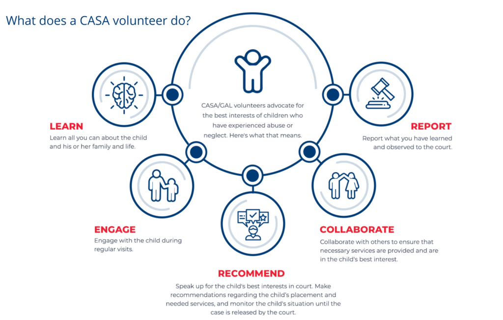 We are seeking volunteers to be trained in fact-gathering and to make informed recommendations to the Court. The CASA volunteer should be a caring adult who seeks to understand the child’s concerns and determine the child’s best interests.